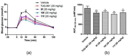 Effects of compounds 5f, 10f, 11f, and TUG-891 on blood glucose levels during the oral glucose tolerance test in fasting ICR mice. (a) Time-dependent changes in blood glucose levels after oral administration of compounds, followed by the oral glucose load (2 g/kg). (b) AUC−30–120 min of blood glucose levels. Values are expressed as the mean ± SD (n = 8). * p ≤ 0.05 compared with vehicle-treated group by Student’s t test; ** p ≤ 0.01 compared with vehicle-treated group by Student’s t test.