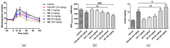 The blood glucose of DIO mice was in the range of 8–9 mmol/L after 12 h of fasting, which was significantly higher than the fasting blood glucose of normal mice. The compound 10f was administered at 1, 3, 10, 30, and 100 mg/kg orally 30 min prior to a glucose challenge of 2 g/kg at a 10 mL/kg dose volume; the control groups were administered a single dose of either vehicle or TUG-891 (30 mg/kg) orally. Glucose levels were measured 30 min before and 120 min after the glucose challenge. Blood glucose levels rapidly increased after glucose administration and reached a maximum after 30 min. Subsequently, blood glucose levels began to decrease and reached normal levels in the 10f-treated (30 and 100 mg/kg) and TUG-891-treated groups at 120 min, while levels remained high in the vehicle-treated group. The AUC between −30 and 120 min was calculated, and the results showed that compound 10f reduced blood glucose levels in DIO mice in a dose-dependent manner. Treatment with 30 and 100 mg/kg of compound 10f reduced the AUC by 20.1% and 32.4%, respectively, compared with the vehicle-treated group, and no hypoglycemia was observed during the experiment (Figure 5a,b). During the experimental period, plasma insulin levels were measured 30 min after glucose administration using an insulin ELISA Kit. The results showed that the insulin levels of the 10f group with an administration of doses greater than 10 mg/kg were significantly higher than that of the control group (Figure 5c).