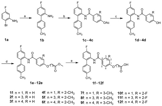 The synthetic route for the target compounds 1f–12f is shown in Scheme 1. Compounds 2-bromo-5-fluoroaniline 1a and 4-tolylboronic acid reacted in a nitrogen atmosphere, catalyzed by palladium tetrakis (triphenylphosphine), to give intermediate 1b through the Suzuki coupling reaction in 71% yield. The condensation of the amino group of intermediate 1b with the carboxyl group of p-acetoxybenzoic acid or the substituted p-acetoxybenzoic acid occurred using 1-ethyl-3-(3-dimethylaminopropyl)carbodiimide hydrochloride as a condensation reagent and triethylamine as a base to obtain intermediates 1c–4c in 51–63% yield. Intermediates 1c–4c were hydrolyzed by NaOH to remove the acetyl protecting group to give intermediates 1d–4d in 73–80% yield. The bromines in methyl bromoacetate, methyl bromobutyrate, or methyl bromovalerate were substituted with the phenolic hydroxyl groups of intermediates 1d–4d via the Williamson ether synthesis to give intermediates 1e–12e in the presence of potassium carbonate. The ester bonds of intermediates 1e–12e were hydrolyzed with the weak base LiOH and then acidified to give target compounds 1f–12f in 46–65% yield (over two steps).
