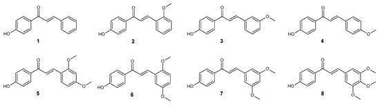 Eight 4′-hydroxychalcones (1–8) were synthesized via Claisen–Schmidt condensation. An equimolar mixture of methoxy-substituted benzaldehyde (40 mmol) and 4′-hydroxyacetophenone (40 mmol) was dissolved in ethanol (200 mL) and NaOH (0.5 mol) was then added to the reaction mixture. The reaction was stirred under reflux conditions for 6–48 h. The progress of the reaction was monitored by thin-layer chromatography (TLC). Upon completion, the reaction mixture was poured into 500 mL of ice-cold acid (1M HCl in water), and the precipitate was filtered, washed with water, and recrystallized from ethanol to obtain pure 4′-hydroxychalcones, according to the procedure described previously [48,50]. The structure of the obtained methoxychalcone (Figure 2, Figure 3, Figure 4, Figure 5, Figure 6, Figure 7, Figure 8 and Figure 9) was confirmed by NMR analysis. The resulting compounds (1–8) were used as substrates for the biotransformation.