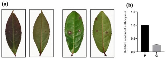 Four days after inoculation with the anthracnose strain, the leaves of healthy tea plants showed clear demarcation and disease symptoms on the epidermal surface, including yellow-brown irregular spots and lesion development (Figure 1a). These symptoms are consistent with those of anthracnose described above. The relative anthocyanin content (Figure 1b) in purple leaves (P) is higher than that in green leaves (G). Moreover, the diseased area (Table 1) of purple leaves (PR) after disease development was lower than that of green leaves (GR). The results also indicate that anthocyanin content is positively correlated with the resistance of tea plants to anthracnose pathogen infection. That means leaves with high anthocyanin content were less impacted by anthracnose infestation than leaves with low anthocyanin.