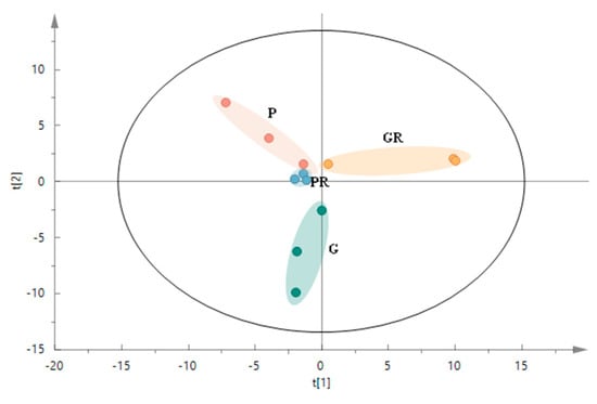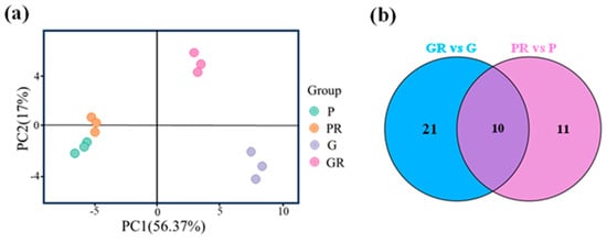 Anthocyanin metabolome assay was performed on four groups of tea plant leaf samples, and a total of 64 anthocyanin-related metabolites were detected. These metabolites were subjected to principal component analysis (PCA). The two PCA axes (Figure 2a) contributed 56.37% and 17% to the variance of the data, respectively. PR, G, and GR all showed significant separation on PC1 and PC2, while P and PR did not exhibit any separation on these two axes. This indicates that there was a significant difference between the metabolites of PR and GR tea plant leaves. The PCA results for anthocyanin show that P and PR metabolites did not differ significantly, and the response of purple leaves to the pathogen infestation after inoculation was minimal. G and GR metabolites differed significantly, suggesting that the green-leaf metabolites responded to the pathogen after inoculation.