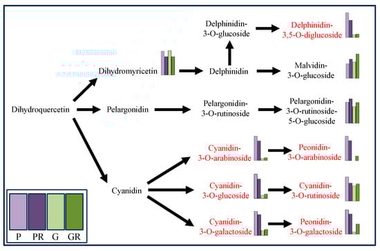 Metabolomics analysis was employed for the targeted determination of anthocyanin metabolites in P and G and the leaves of PR and GR after infection with anthracnose. Using VIP > 1.0 and p-value < 0.05 as the screening criteria, a total of 10 significantly different metabolites were screened (Figure 2b). Among these, the contents of seven key flavonoid metabolites (cyanidin-3-O-glucoside, cyanidin-3-O-arabinoside, cyanidin-3-O-galactoside, cyanidin-3-O-rutinoside, Delphinidin-3,5-O-diglucoside, Peonidin-3-O-galactoside, and Peonidin-3-O-arabinoside) exhibited the same change trend after pathogen infestation, which manifested as a decrease in the PR content and an increase in the GR content (Figure 3).