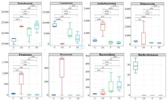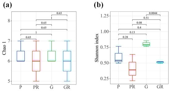 In terms of bacterial diversity (Figure 4b), there were significant differences between the samples of G and GR (p < 0.05). No significant differences were observed between the richness indices of the bacterial communities of PR and GR. Furthermore, the diversity indices of the bacterial communities decreased in PR and GR compared with P and G. Similarly, there were no significant differences between the richness indices of the bacterial communities of P and PR and the diversity indices of the bacterial communities of P and PR.