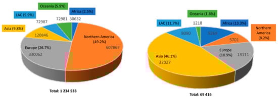 Estimated numbers of new skin non-melanoma cases and deaths worldwide in 2022 for both sexes and all ages: incidence (left) and mortality (right). Data adapted from the Globocan Cancer Observatory by IARC [].