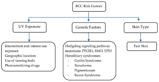 In sporadic BCC cases without hereditary factors, the genetic landscape is not fully understood. However, mutations in the hedgehog (Hh) pathway are found in about 85% of these BCCs, primarily involving PTCH1 (70–75%), SMO (10–20%), and TP53 (40–65%). PTCH1 mutations disrupt the sonic hedgehog signaling, while TP53 mutations impair the p53 protein’s function, promoting BCC growth. Understanding these genetic changes is essential for developing targeted therapies to mitigate tumor progression []. Skin type plays a significant role in the risk and development of BCC. According to the literature, Fitzpatrick skin types I (very fair skin) and II (fair skin) are more likely to develop BCCs, with a lifetime risk of 30% []. As highlighted below in Figure 3, key environmental and genetic factors contribute to BCC pathogenesis, illustrating the interplay between UV exposure, genetic mutations, and hereditary syndromes.