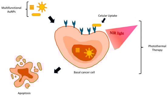 In terms of PTT and BCC, Pesnel and collaborators reported the first proof of concept for PTT/AuNPs applied to BCC. The study demonstrated that NIR laser stimulation of AuNPs induced significant exalted hyperthermia within minutes, even at a low power of 1 W. Preclinical feasibility and safety were confirmed on small surface lesions (50 mm3), paving the way for studying PTT on larger tumor volumes (>50 mm3) [].