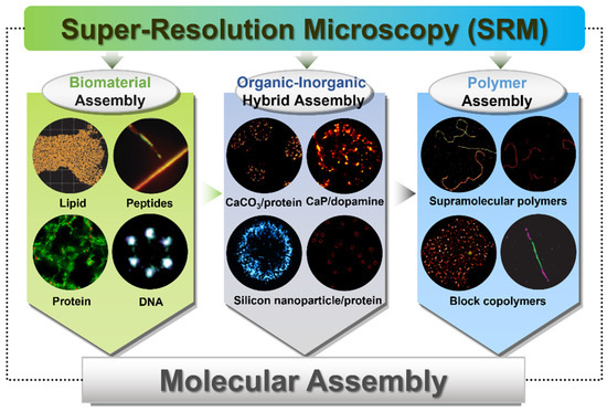 Super-resolution microscopy (SRM) techniques have greatly revolutionized the way that we study biological systems since their advent, breaking the diffraction limit and allowing the observation of samples as low as tens of nanometers and even at the single molecule level. Since the acknowledgement of the Nobel Prize in Chemistry in 2014 [18], SRM techniques have gained enormous interest from the fields of biology to other realms of science, including biomedicine, physics, plant science, and food science [19,20,21,22,23,24,25,26]. In recent years, SRM technologies have also become increasingly influential in materials science and chemistry as a method to reveal the dynamics and structures of assembled materials, which facilitate the visualization of materials with minimal invasiveness in operando [22,27]. More importantly, the use of SRM has also revolutionized the way that we comprehend supramolecular chemistry and molecular assemblies, complementing existing techniques and allowing us to address the individual dynamics and structures of molecular assembly by visualizing the individual self-assembled objective with its unprecedented temporal and spatial resolutions [17,28]. Different from TEM and SEM, SRM enables multicolor imaging with appropriate fluorescent labelling for detecting molecule interactions and provide in situ imaging, which can avoid the invasion of sample preparation and the drying or freezing procedure [17]. SRM herein has played an important role in the investigation of molecular assemblies and promoted the research of the structure of complex assembled materials [28,29,30].