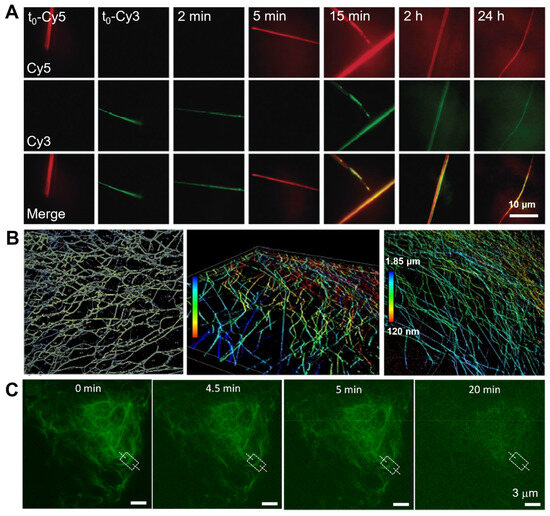 Using PAINT imaging with a high spatiotemporal resolution, Albertazzi and co-authors discovered the dynamic and structural features of diphenylalanine (FF) nanofibers schematically [86]. Through the multicolor SRM imaging and two-color kinetic experiments, the FF nanofibers were found to be dynamic, exchanging monomers over time until reaching a thermodynamic equilibrium, which is indicated by the Cy5 and Cy3 probes incorporated equally (Figure 3A). It was confirmed that the obtained FF nanofibers exist the heterogenous behavior. Meanwhile, non-exchanged static aggregates also co-exist alongside those that are fully exchanged. Recently, Albertazzi and co-workers identified Fmoc-FF hydrogels through PAINT imaging without labelling the gels. This approach has enabled the visualization of fiber networks with an enhanced resolution, reaching down to approximately tens of nanometers (~50 nm) in both two-dimensional and three-dimensional contexts. This has facilitated the determination of crucial parameters such as fiber diameter and mesh size (Figure 3B) [87]. The PAINT technique opens up avenues for employing super-resolution imaging in the analysis of gels, enabling a direct visualization of the network structure. It provides insights into the spatial variability of important features, aiding in a comprehensive comprehension of hydrogel networks, their assembly processes, and the influence of these factors on their mechanical characteristics.