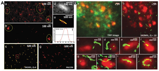 BALM is based on the principle that the fluorescent dye YOYO-1 could show a strong fluorescence enhancement upon binding to double-stranded DNA [38,106]. Li and co-authors used BALM to image triangle DNA origami for the first time with a dramatic resolution enhancement [106]. The intricate geometry and small size of triangle DNA origami also present stringent demands on the localization precision and algorithms, and both FALCON and SNSMIL have demonstrated the capability to visualize tubular structures (Figure 5A). The synthetic DNA nanostructures in NIH 3T3 cells, also illustrated using BALM imaging, revealed the detailed interactions through the combination of the TIRF images of lysosomes and the fluorescence localization images of the tube DNA origami nanostructures (Figure 5B) [106]. The capture as well as the degradation by lysosomes with the time of the tube DNA origami have also been illustrated. Furthermore, the chromosomal organization in fixed Escherichia coli cells was imaged using BALM, through a strong fluorescence enhancement emitted by YOYO-1 as it binds to double-stranded DNA [38]. The precise colocalization of proteins with DNA was achieved through BALM enhanced by YOYO-1 and PALM assisted by genetically encoded fluorescent protein tags, yielding a resolution down to a few base pairs.