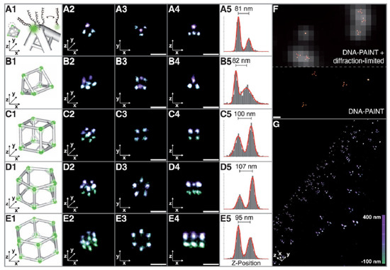 Utilizing DNA-PAINT, Simmel and colleagues explored the dynamic behavior of DNA nanostructures, enabling the routine analysis of DNA binding and unbinding kinetics. This approach further allowed for the determination of the varied parameters of the binding sites on the nanostructures and the corresponding kinetic rates [39]. They have demonstrated ribbon-like, flat, monomeric DNA structures as well as multimeric DNA structures by using the reversible specific binding of labeled oligonucleotides to DNA nanostructures in PAINT imaging. Lately, using DNA-PAINT in solution, Jungmann and co-workers accurately constructed and characterized the 3D polyhedra structures, including tetrahedron, triangular, pentagonal, and hexagonal prisms, and cubes from DNA tripods. They achieved an impressive resolution of roughly 13 nanometers along the x and y axes, and about 24 nanometers along the z axis (Figure 6) [107]. As 3D analogs to the 2D rectangle, DNA origami barrels were also presented [108]. The modularity of DNA barrel structures has facilitated the swift adoption of this technology across a wide range of fields, extending its reach beyond the specialist communities engaged in DNA nanotechnology [108]. SMLM encoded the peptide–protein interaction upon cellular fixation with a novel peptide–PAINT probe without additional labeling [109] and a DNA origami platform in super-resolution could also quantify the protein copy number [110].