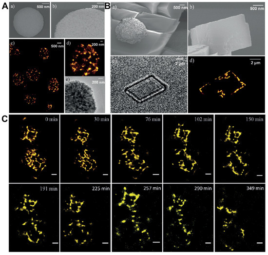 Except for CaCO3-/CaP-based hybrid assemblies, the metal–organic framework (MOF)-based hybrids were also explored using single-molecule localization microscopy [128]. Ge et al. obtained protein@metal-organic frameworks (P@MOFs) via the coprecipitation process and employed dSTORM to resolve the specific three-dimensional localization of the protein inside the P@MOF with ZIF-8 as the matrix. Using a combined methodology of SRM and a clustering analysis, they discovered that enzyme molecules form clusters with metal ions and organic ligands and participate in the coprecipitation process, contributing to both the nucleation and subsequent crystal growth. Furthermore, the internal structures of nanocomposite crystals were characterized using 3D STORM, pinpointing the locations of fluorescent nanoparticles within individual calcite crystals. This technique offered an independent confirmation of the development of dislocation loops with distinctive geometries upon the nucleation of calcite at substrates, thereby providing deeper insights into the processes by which additives are incorporated within the crystal lattice [126].