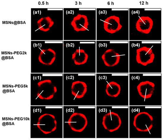 Zoomed dSTORM images of protein adsorption onto MSNs and MSNs-PEGx (x = 2k, 5 k, 10 k) particles after incubation with BSA solution for different timescales (Scale bars: 1 μm). Reproduced with permission from [147].