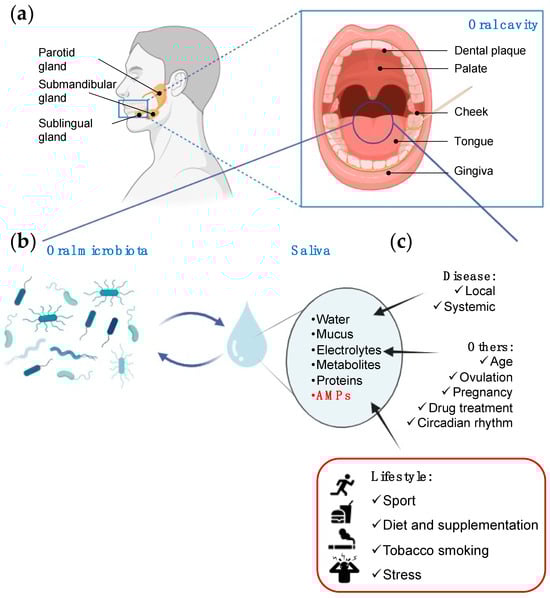 The oral cavity is a complex ecosystem with many subsites, including tooth surfaces, gingiva, cheek, palate, tongue, and saliva (Figure 1a). Saliva is a fluid secreted into the mouth by salivary glands and composed of water, proteins, metabolites, electrolytes, and antimicrobial peptides (AMPs) []. Saliva functions involve lubricating the mouth, stabilizing oral pH, aiding teeth remineralization, preparing food for swallowing, starting digestion, and modulating growth and adherence of oral microorganisms to tooth surfaces []. Saliva is crucial for maintaining oral health, and, due to its composition and functions, it is considered the “mirror of the body,” reflecting virtually the entire spectrum of normal and disease states []. Because of the molecular exchange between blood and saliva, saliva is a good indicator of the plasma levels of various substances such as hormones or drugs. A correlation has been observed between serum and saliva concentrations of specific metabolites []. Therefore, saliva is an attractive fluid for diagnostic purposes. However, even if salivary biomarkers may provide information about local and systemic diseases [], the large variability in saliva composition compared with blood or urine is one of the challenges for using saliva in diagnostics [,].