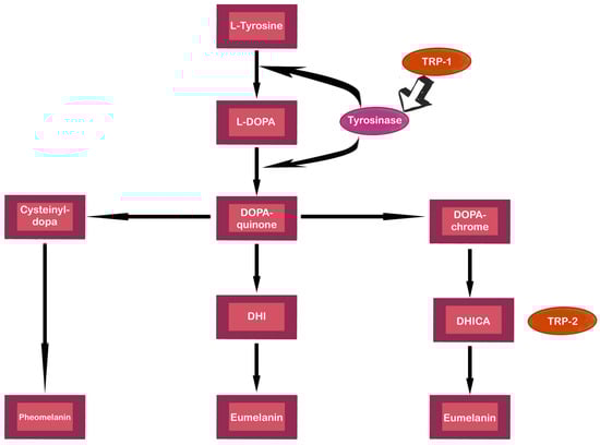 The schema of the melanogenesis pathway. Tyrosinase is an enzyme that catalyzes the conversion of L-tyrosine into L-DOPA. Tyrosinase-related protein 1 (TRP-1) and tyrosinase-related protein 2 (TRP-2) stabilize and increase the activity of TYR. Moreover, TRP-1 upturns the eumelanin vs. pheomelanin ratio. TRP-2 takes part in the tautomerization of DOPA chrome into DHI-2-carboxylic acid (DHICA). TRP-1 oxidases DHICA. The figure is based on the data of the studies [,,].