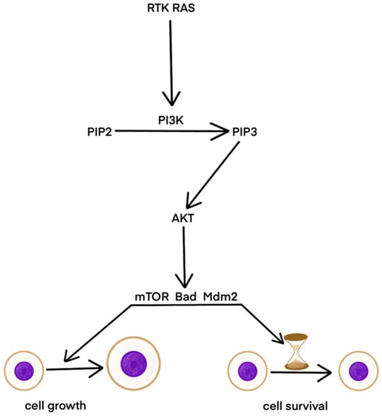 The development of cutaneous melanoma is often the result of mutations in signaling pathways critical for cell survival, such as the MAPK and PI3K/AKT pathways. The MAPK pathway regulates cell growth, proliferation, differentiation, and apoptosis. Mutations in this pathway lead to excessive signal activation and uncontrolled cell growth. Activation occurs through the binding of a growth factor to receptor tyrosine kinase (RTK), triggering the RAF, MEK, and ERK cascade, which activates transcription factors. The PI3K/AKT pathway also influences cell growth and proliferation. PI3K, activated by RTK or RAS, phosphorylates PIP2 to PIP3, which activates AKT. AKT promotes cell growth and survival through mTOR, Bad, and Mdm2 (Figure 2) [].