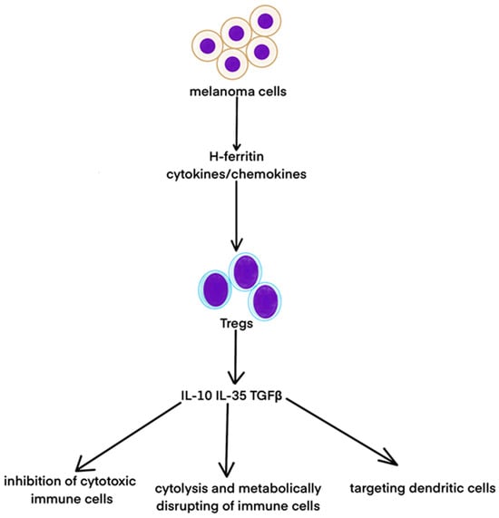 Melanoma cells secrete H-ferritin, cytokines, or chemokines, which activate Tregs to secrete IL-10, IL-35, and TGFβ. These factors lead to the inhibition of cytotoxic immune cells, cytolysis, and the metabolic disruption of immune cells and targeting dendritic cells.