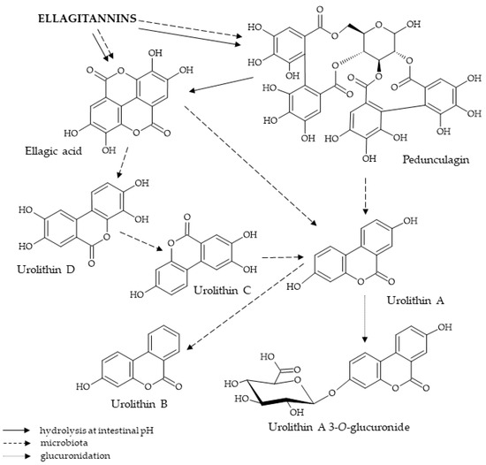 Ellagitannins, which include pedunculagin, are hydrolyzed in the acidic environment of gastric acids, resulting in the formation of HHDP acid, which then spontaneously lactonizes to ellagic acid [126]. No presence of ellagitannins in blood and urine has been observed, indicating that they are metabolized by the digestive system. The most common metabolite detected in human urine following the ingestion of raw materials containing ellagitannins is 3,8–dihydroxy–6H–dibenzo[b,d]pyran–6–one, known as urolithin B. This is mainly present in the glucuronic acid-conjugated form and, in smaller amounts, as the corresponding aglycone [127]. A study conducted on a group of volunteers involved supplementation with pomegranate juice over five consecutive days and the determination of urinary concentrations of ellagitannin metabolites. In some subjects, low concentrations were observed as early as the first day, with maximum concentrations being reached between days 3 and 4, followed by a slight decrease after 24 h, albeit in significantly lower amounts. On this basis, it was concluded that colonic microbiota were responsible for the metabolism and absorption of the compounds formed by the modification of ellagitannins [128]. Microbiota-mediated degradation of ellagic acid was also suggested by the absence of urolithins in the urine of patients with ileostomies [129]. Figure 2 presents the modifications of the pedunculagin molecule occurring during its systemic metabolism.