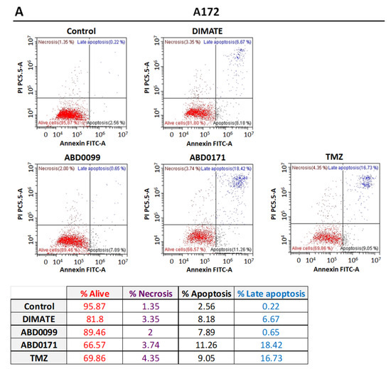 Cell death analysis by flow cytometry after 24 h of incubation with TMZ equimolar concentrations of DIMATE, ABD0099 and ABD0171 in (A) A172 and (B) GL261 cells. Iodide propidium labeling (necrosis) is represented in the y axis, whereas annexin V labeling (apoptosis) is represented in the x axis. Cells in the PI positive region of the cytogram could come from either necrotic or late-apoptotic cells. The result of a single representative experiment is shown here, consisting of duplicates (n = 2) for each drug treatment (to simplify, only one of the duplicates is shown). The experiment was performed at least twice independently.