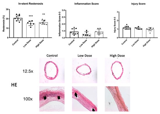 After the 42-day follow-up, histological restenosis in the stented artery was 20.9 ± 3.0% in the control animals. DHIF-treated animals showed a significantly lower ISR of 15.2 ± 2.4% and 16.4 ± 2.1% (low dose,