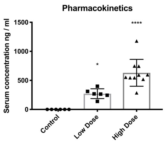 p < 0.0001) in the low- and high-dose groups, respectively. No drug was detected in the control animals (