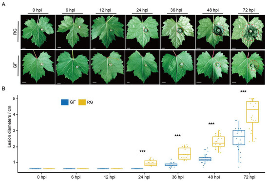 Resistance assessment of GF and RG varieties defense against C. vitis. (A,B) show the phenotypes and lesion diameters of GF and RG varieties following inoculation with C. vitis at 0, 6, 12, 24, 36, 48, and 72 hpi. The red dashed line is used to mark the boundaries of the diseased area on the leaves. Bar = 1 cm. For each cultivar, the lesion diameters of 30 leaves were counted. Significant differences are indicated by different letters (*** p < 0.001).