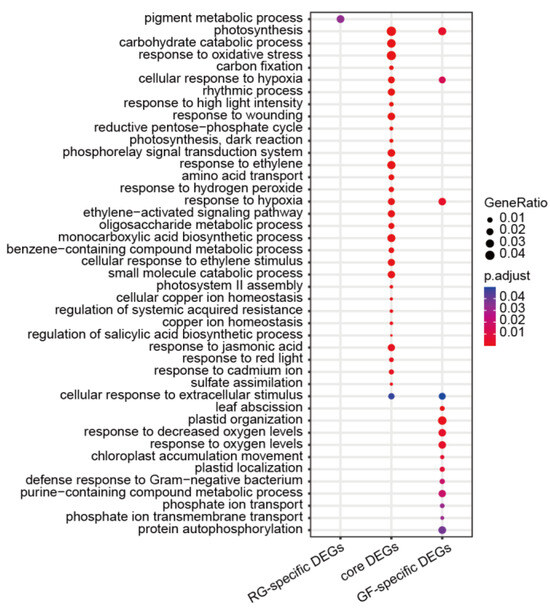 GO analysis of RG-specific DEGs, core DEGs, and GF-specific DEGs. The shared DEGs between GF and RG were categorized as core DEGs, while the unique DEGs were classified into RG-specific and GF-specific DEGs.