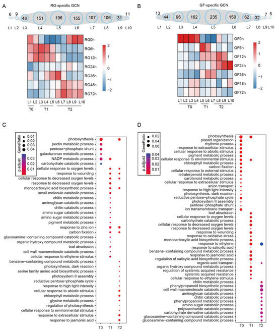 Construction of TO-GCNs and the functions of co-expression genes. (A,B) The TO-GCNs were constructed with TF genes for RG and GF varieties. In a TO-GCN, each node (blue dotted circles) represents a TF gene and the number in each level represents the number of TF genes at that level (Top). The heatmaps were generated with the mean z-score of TF gene expression at each level (Bottom). T0: the uninoculated stage; T1: the early inoculation stage; T2: the late inoculation stage. (C,D) GO enrichment analysis for T0, T1, and T2 group genes in the RG-specific GCN and GF-specific GCN.