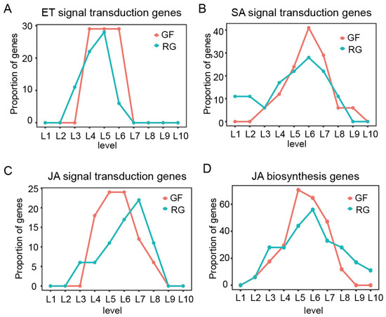 The proportions of plant hormone-related genes at each level in GF-specific and RG-specific GCNs. (A–C) Genes in ET, SA, and JA hormone signal transduction pathways. (D) Genes in JA hormone biosynthesis pathway. In RG, levels L1 and L2 corresponded to the T0 stage (0 hpi), levels L3 to L5 corresponded to the T1 stage (6–12 hpi), and levels L6 to L10 corresponded to the T2 stage (24–72 hpi). In GF, levels L1 to L4 corresponded to the T0 stage (0 hpi), levels L5 and L6 corresponded to the T1 stage (6 hpi), and levels L7 to L10 corresponded to the T2 stage (12–72 hpi).