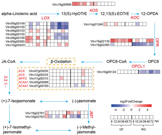 The module of the JA biosynthesis pathway in GF and RG varieties in response to C. vitis infection. LOX: lipoxygenase; AOS: hydroperoxide dehydratase; AOC: allene oxide cyclase; OPR: 12-oxophytodienoic acid reductase; OPCL1: OPC-8:0 CoA ligase 1; ACX: acyl-CoA oxidase; MFP2: enoyl-CoA hydratase/3-hydroxyacyl-CoA dehydrogenase; ACAA1: acetyl-CoA acyltransferase 1; and JMT: jasmonate O-methyltransferase. Gene expression profiles at various time points are displayed in the heatmap alongside the names of enzymatic genes.