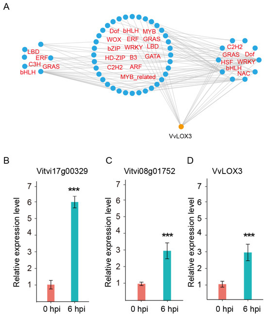 Regulators of the VvLOX3 gene in grapevine resistance to C. vitis. (A) Resolved hierarchical regulation for VvLOX3 in GF-specific GCN. (B–D) Relative expressions of Vitvi17g00329, Vitvi08g01752, and VvLOX3 in GF leaves at 0 and 6 h post-inoculation (hpi) with C. vitis. Relative expression levels of three genes were assessed by RT-qPCR. Error bars represent standard errors of three biological replicates; *** p < 0.001, according to unpaired Student’s t-tests.