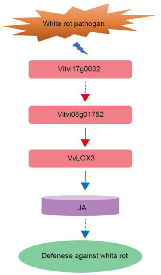 Regulatory model for VvLOX3 gene in GF response to white rot. Red dashed line with an arrow: validation by qRT-PCR. Red solid line with an arrow: validation by qRT-PCR and Y1H assays.