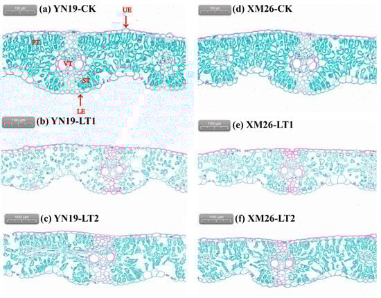 Comparison of flag leaf anatomy between Yannong19 (YN19) and Xinmai26 (XM26) in CK (a,d), LT1 (b,e), and LT2 (c,f). Legend: UE—upper epidermis; LE—lower epidermis; PT—palisade tissue; ST—spongy tissue; VT—vascular tissue. CK refers to treatment at 15 °C and spraying H2O; LT1 refers to treatment at −4 °C and spraying H2O; LT2 refers to treatment at −4 °C and spraying KH2PO4.