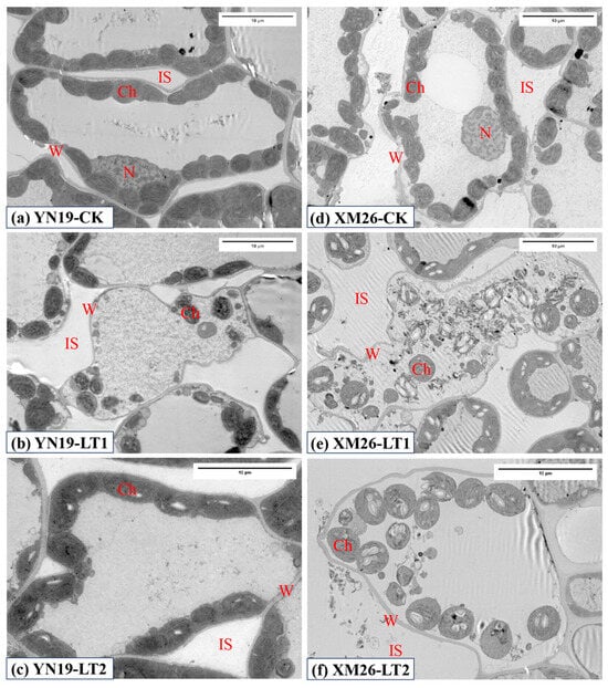 Comparison of ultrastructure of flag leaf mesophyll cell between Yannong19 (YN19) and Xinmai26 (XM26) in CK (a,d), LT1 (b,e) and LT2 (c,f). Legend: Ch—chloroplast; W—cell wall; N—nucleus; IS—intercellular space. CK refers to treatment at 15 °C and spraying H2O; LT1 refers to treatment at −4 °C and spraying H2O; LT2 refers to treatment at −4 °C and spraying KH2PO4.