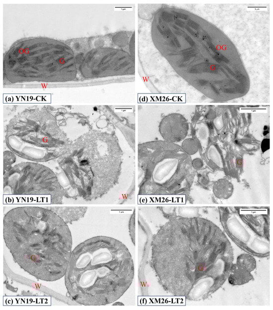 Comparison of ultrastructure of flag leaf meat cells between Yannong19 (YN19) and Xinmai26 (XM26) in CK (a,d), LT1 (b,e) and LT2 (c,f). Legend: W—cell wall; G—grana; OG—osmiophilic granule. CK refers to treatment at 15 °C and spraying H2O; LT1 refers to treatment at −4 °C and spraying H2O; LT2 refers to treatment at −4 °C and spraying KH2PO4.
