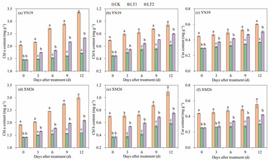 The chlorophyll a (Chl a), chlorophyll b (Chl b), and carotenoid (Car) contents in the flag leaves of the two wheat varieties exhibited a rising trend as the growth stages progressed (Figure 4). Compared to CK, the contents of Chl a, Chl b, and Car in the YN19 and XM26 flag leaves at 0–12 DALTT decreased by 39.3%, 35.2%, and 34.7% and 35.9%, 43.9%, and 43.0%, respectively, via LT1, and increased by 27.1%, 24.3%, and 19.0%, and 26.1%, 28.2%, and 30.8%, respectively, via LT2. Compared to LT1, the contents of Chl a, Chl b, and Car in the YN19 and XM26 flag leaves at 0–12 DALTT increased by 21.7%, 16.7%, and 24.2%, and 16.7%, 27.8%, and 21.8%, respectively, via LT2.