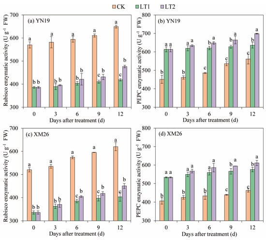 Comparison of activities of Rubisco (a,c) and PEPC (b,d) of flag leaves between Yannong19 (YN19) and Xinmai26 (XM26) in different treatments. The standard deviation (SD) values from three replicates are represented by error bars in figures, and different lowercase letters indicate significant differences at the p < 0.05 level within each day of treatment. Rubisco—Ribulose–1,5–bisphosphate carboxylase; PEPC—phosphoenolpyruvate carboxykinase. CK refers to treatment at 15 °C and spraying H2O; LT1 refers to treatment at −4 °C and spraying H2O; LT2 refers to treatment at −4 °C and spraying KH2PO4.