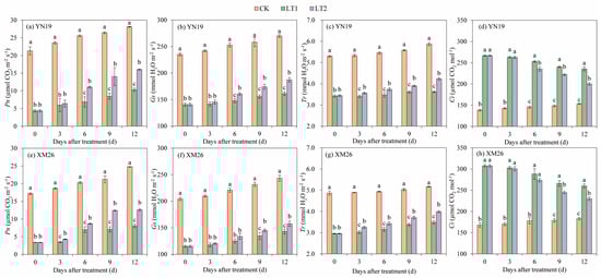 Comparison of Pn (a,e), Gs (b,f), Tr (c,g), and Ci (d,h) of flag leaves between Yannong19 (YN19) and Xinmai26 (XM26) in different treatments. The standard deviation (SD) values from three replicates are represented by error bars in figures, and different lowercase letters indicate significant differences at the p < 0.05 level within each day of treatment. Pn—net photosynthetic rate; Gs—stomatal conductivity; Tr—transpiration rate; Ci—intercellular CO2 concentration. CK refers to treatment at 15 °C and spraying H2O; LT1 refers to treatment at −4 °C and spraying H2O; LT2 refers to treatment at −4 °C and spraying KH2PO4.