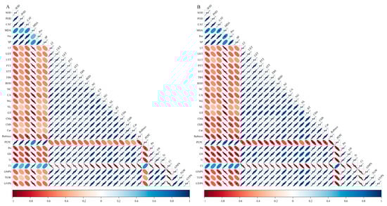 Correlation analysis of flag leaf indexes of Yannong19 (YN19, A) and Xinmai26 (XM26, B). *, **mean p < 0.05, p <0.01. Red indicates negative correlation and blue indicates positive correlation. The upper left and lower right direction of the ellipse represents negative correlation, the upper right and lower left direction represents positive correlation, and the smaller the ellipse, the more significance it is. Legend: LT—leaf thickness; UET—upper epidermis thickness; LET—lower epidermis thickness; PTT—palisade tissue thickness; STT—spongy tissue thickness; TBS—tightness of the blade structure; BDD—blade structure dredging density; NC—number of chloroplasts; CA—chloroplast area; NG—number of grana; NL—number of grana lamellae; GT—grana thickness; GNPS—Grain number per spike; TGW—1000-grain weight; GYPS—grain yield per stem; YLR—yield loss rate; YRR—yield recovery rate.