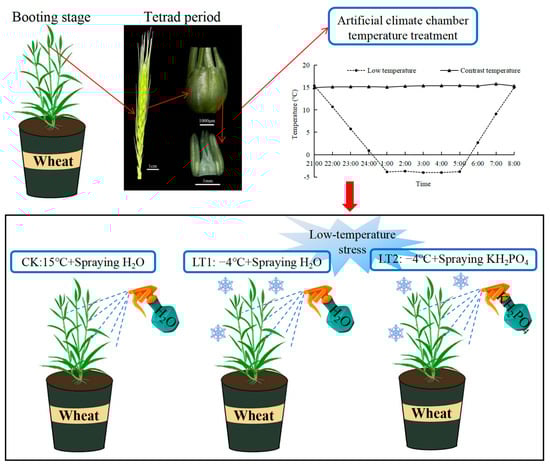 The experiment was designed with two varieties, three treatments, and five periods, with 10 pots of wheat plants at each period, and each parameter was measured with 3 replications. We observed different growth stages and growth patterns of wheat under a microscope (Olympus SZ2-ILST; Tokyo, Japan) []. During the wheat booting stage (from spike differentiation to tetrad formation period), pots with uniformly growing plants were selected for low-temperature treatment in an artificial climate chamber (the relative humidity 70%, light intensity 0 Lx, temperature variation ±0.5 °C, temperature control range −10~40 °C, Nanjing Hengyu Instrument Equipment Manufacturing Co., Ltd., Nanjing, China). According to previous studies [,], the low-temperature treatment was conducted from 1:00 to 5:00 a.m. for four consecutive hours, and each pot was sprayed with 200 mL of 0.2% KH2PO4 solution after treatment, while the control pots were sprayed with an equal amount of water. The pots were then returned to their original field locations to continue growing until maturity. Other management measures were the same as the local high-yield field practices. For each treatment group of the two wheat varieties, wheat plants with consistent growth status were sampled at 0, 3, 6, 9, and 12 d DALTT (10 pots per treatment). Flag leaves from the main stems were immediately frozen in liquid nitrogen, transported back to the laboratory, and stored at −80℃ for subsequent physiological measurements. A schematic diagram outlining the experimental design and treatments is shown in Figure 8.