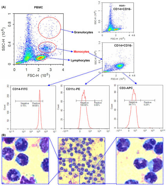 The purity of isolated human peripheral blood CD14+CD16− monocytes—Purity investigation of magnetically isolated CD14+ monocytes by flow cytometry and microscope. Data were analyzed using NovoExpress software version 1.5.0. (A) The dot plots of forward scatter against side scatter. Representative dot plot of human PBMCs, CD14−, and CD14+ cells. CD14+ cells were surface labeled with CD14-FITC, CD11c-PE, CD3-APC antibodies. (B) Images representative of the subject were taken using a microscope. Monocytes were stained with Wright-Giemsa, revealing dark purple nuclei and a sky blue cytoplasm. Scale bar is 10 μm. 1000× magnification.