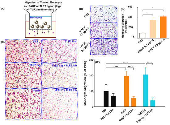 PAUF induces the chemotactic migration of monocytes—Chemotaxis of monocytes by transwell migration assay. (A) Schematic of the transwell chemotaxis model. Monocytes were seeded in the upper chamber at 3 × 105 cells/200 μL. The chemoattractant PAUF (0.1 μg/mL or 0.5 μg/mL) was added to the lower chamber. PBS served as a control. (B) After 20.5 h of incubation, the migrating monocytes were stained with Giemsa stain, and the cells in the fields were counted. (B`) The bar chart displayed the percentage of migrated cells compared to the PBS group. (C) Human CD14+ monocytes were seeded in the upper chamber at 1.5 × 105 cells/200 μL with or without TLR2 inhibitor (125 μM). The lower chamber was supplemented with the chemoattractant PAUF (0.5 μg/mL), Pam 3Cys (100 ng/mL). After 22.5 h of incubation, Giemsa stain was used to stain the migrated monocytes and the cells were counted in captured fields. Representative images of PBS and PAUF treated groups. All scale bars are 200 μm. 100× magnification. (C`) Bar chart showing the number of migrated cells, represented as a relative percentage to PBS group. The data were presented as the mean ± standard deviation from a minimum of three independent experiments. *, p < 0.05; ****, p < 0.0001.