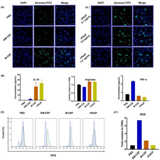 PAUF increases the phagocytosis ability of macrophages—(A) Fluorescence microscopy images of macrophages exposed to Zymosan for 2 h and stained with DAPI (nuclear stain). Cells were seeded on 0.1% gelatin-coated cover slides and differentiated for 7 days, followed by Zymosan reaction, and then fluorescence images were confirmed. Scale bars are 50 μm. 400× magnification. Blue, DAPI-stained nuclei; Green, fluorescent Zymosan. (A`) Images were taken in the presence of rPAUF (0.1 µg/mL, 0.5 µg/mL and 1 μg/mL). (B) Assessment of macrophage polarization was determined by comparison of the marker expression of M1 (TNF-α) and M2 (IL-10 and Arginase). On day 7, the levels of TNF-α and IL-10 were analyzed using ELISA in cell culture supernatants. Arginase activity was measured by a colorimetric assay. (C) The intracellular ROS production was analyzed by flow cytometry using Carboxy-H2DCFDA. The blue represents the cell-only group, while the green indicates ROS labeled with FITC. (C`) The bar chart represented a relative percentage of the PBS group. The data were presented as the mean ± SD from a minimum of three independent experiments.
