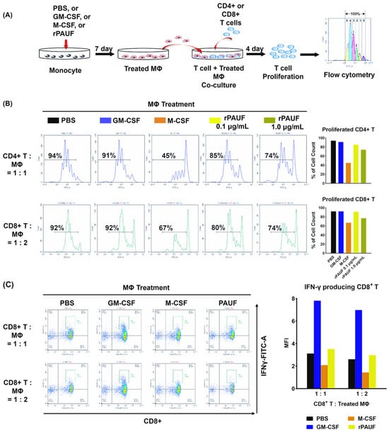 PAUF promotes the transformation of monocytes into M2 macrophages by inhibiting T cell proliferation. (A) Schematic description of the experiments. Monocytes differentiated into macrophages by incubating with PBS, GM-CSF, M-CSF, or PAUF for 7 days. To perform the suppression assay, isolated (B) CD4+ T cells or (C) CFSE-labeled CD8+ T cells were stimulated with anti-CD3/CD28 microbeads and co-cultured with macrophages in 1:1 or 1:2, or 1:0.5 ratio, respectively. After 4 days of co-culture, T cells were gathered and marked with anti-CD4-PerCP or CD8-PE/Cyanine7 to assess T cell growth utilizing flow cytometry. Data were analyzed using NovoExpress software version 1.5.0. The histograms represent the CFSE fluorescent peaks of proliferating T cell populations.