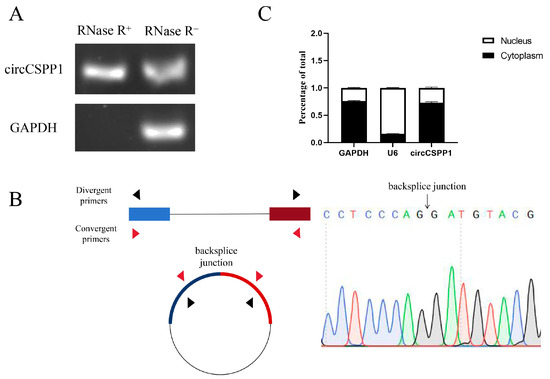 Identification and localisation of circCSPP1. (A) Amplification results of circCSPP1 after RNase R digestion. (B) The splicing junction sequencing diagram of circCSPP1. (C) Nucleoplasmic localisation of circCSPP1.