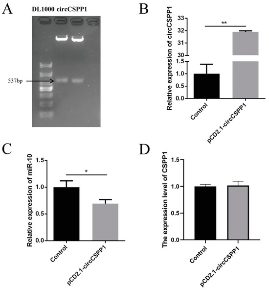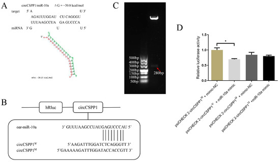 Validation of circCSPP1 with miR-10a targeting. (A) The prediction result of circCSPP1 with miR-10a. (B) The binding sites of circCSPP1 and miR-10a. (C) Validation of circCSPP1 amplification results. (D) Validation of circCSPP1 and miR-10a binding sites. * represents significant difference (p < 0.05).