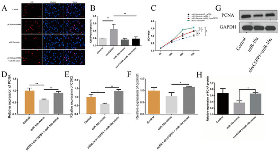 The effect of circCSPP1 targeting miR-10a on the proliferation of DPCs. (A) The effect of transfection with circCSPP1 overexpression vector after miR-10a overexpression on the proliferation of Hu sheep DPCs, the scale is 400 µm. (B) The rate of proliferating cells. (C) The viability of DPCs. (D) The relative mRNA expression of PCNA. (E) The relative mRNA expression of CDK2. (F) The relative mRNA expression of cyclind1. (G) The relative protein expression of PCNA. (H) The grayscale analysis of PCNA protein. * represents significant difference (p < 0.05) and ** represents extremely significant difference (p < 0.01).