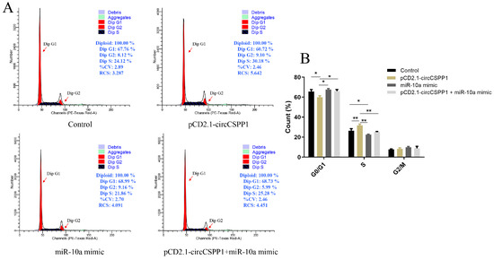 To clarify that circCSPP1 can competitively bind miR-10a to affect the cell cycle of DPCs in Hu sheep, the effect of exogenous addition of circCSPP1 on changes in cell cycle after overexpression of miR-10a was analysed using PI staining. After overexpression of circCSPP1, the S-phase of DPCs of Hu sheep was extremely significantly higher than that of the control group (p < 0.01), and after overexpression of miR-10a, the S-phase was decreased compared to that of the control group, but the S-phase of DPCs was restored to the level of the control group by the exogenous addition of circCSPP1 (Figure 5). The results showed that circCSPP1 had a promoting effect on the cell cycle of DPCs and that the exogenous addition of circCSPP1 is able to restore the slowed cell cycle progression by miR-10a overexpression.
