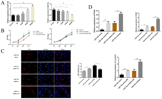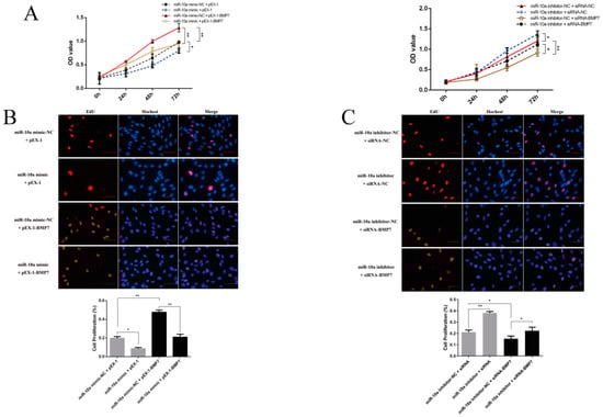 The targeting relationship between miR-10a and BMP7 has been previously verified [14]. The effect of miR-10a targeting BMP7 on the proliferation of DPCs was further verified. Firstly, the expression of miR-10a was detected by transfecting different concentrations of miR-10a mimics and inhibitors into DPCs. The results showed that when the miR-10a mimic with a final concentration of 100 nM was transfected, the miR-10a expression level in the DPCs was extremely significantly higher than that in the mimic-NC group (p < 0.01). When miR-10a inhibitor with a final concentration of 200 nM was transfected, the miR-10a expression level in the DPCs was extremely significantly lower than that in the inhibitor-NC group (p < 0.01) (Figure 6A). Therefore, the final concentrations of 100 nM and 200 nM were ultimately chosen for the miR-10a mimic and inhibitor, respectively, as the transfection concentrations for subsequent procedures. The CCK-8 results showed that when miR-10a was overexpressed by transfecting the miR-10a mimic into DPCs, a significant decrease in cell viability was observed at 48 h and 72 h compared to the negative control group (p < 0.05). Conversely, when miR-10a expression was inhibited by transfecting miR-10a inhibitor, a significant increase trend at 72 h (p < 0.05) (Figure 6B). The EdU assay was performed to assess the proliferation of DPCs, and the results indicated that the amount of cell proliferation in the miR-10a mimic group was significantly lower than that in mimic-NC group (p < 0.05). Conversely, the amount of cell proliferation in the miR-10a inhibitor group was significantly higher than that in inhibitor-NC group (p < 0.05) (Figure 6C). These findings suggested that miR-10a exerted an inhibitory effect on the proliferation of DPCs.