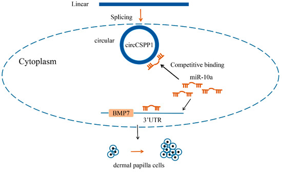 In conclusion, we reveal that circCSPP1 is capable of regulating the expression of BMP7 binding to miR-10a, thereby promoting the proliferation of DPCs in Hu sheep. Our study will provide benefits for further research into the processes of the growth and development of hair follicles (Figure 8).